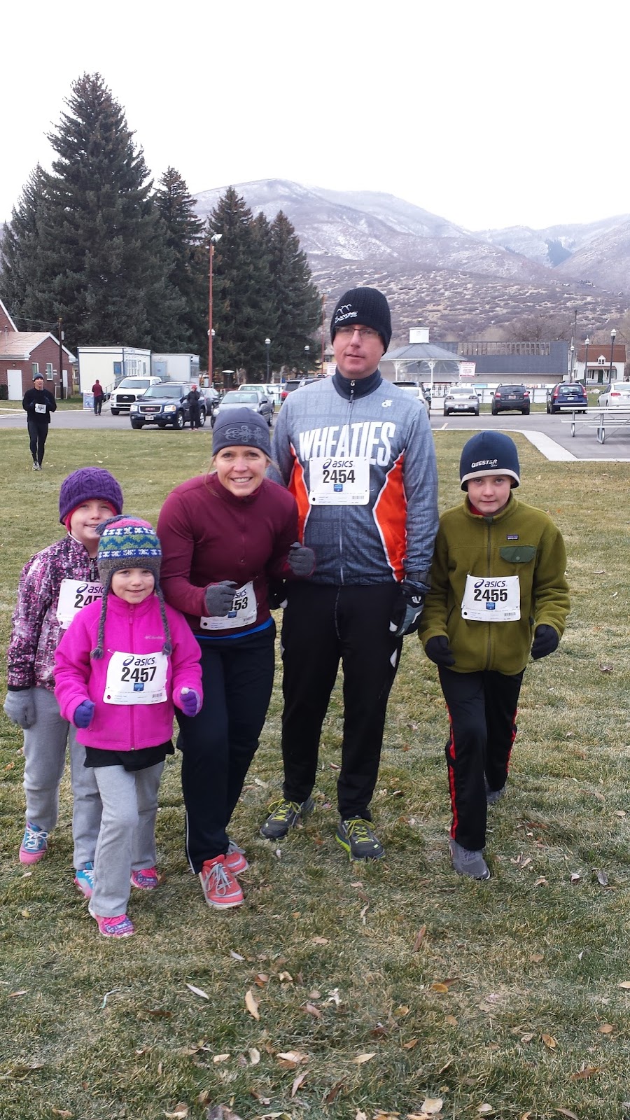 But before I jump to Christmas, we need to talk about Thanksgiving.  We had a great weekend.  We started a new tradition of running a Turkey Trot as a family.  It was so great.  I was going to have Sage ride her bike, but she really wanted to run.  So all of us ran and it was awesome.  The kids did great, especially Sage.  I was amazed.  She's never even run even close to that far before, but she ran pretty much the whole way.  She was passing people left and right and just kept going.  She ended up finishing in just under 34 minutes.  Crazy!  She was super tired after and took two big naps in the car that day, but I was impressed.  It was a lot of fun to run a race with the whole family.  Definitely a great tradition.